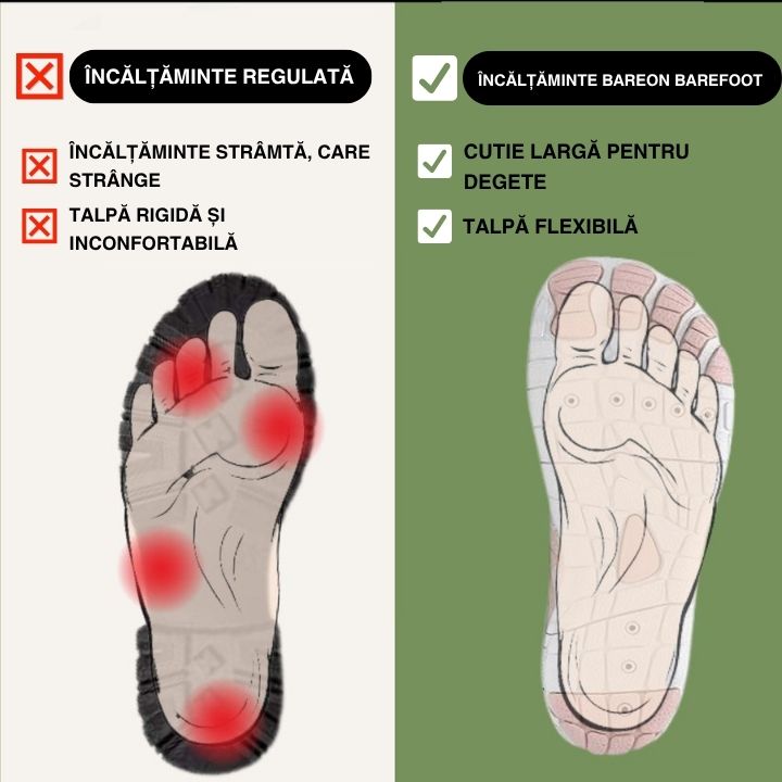 Cu pantofii desculți BAREON, alegeți confortul, picioarele sănătoase și o experiență naturală de mers. Acești pantofi unici vă oferă senzația de a merge desculț, oferind în același timp protecție și susținere.